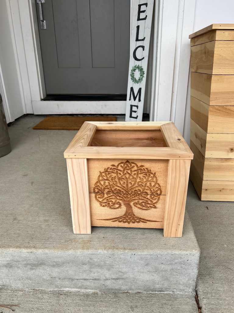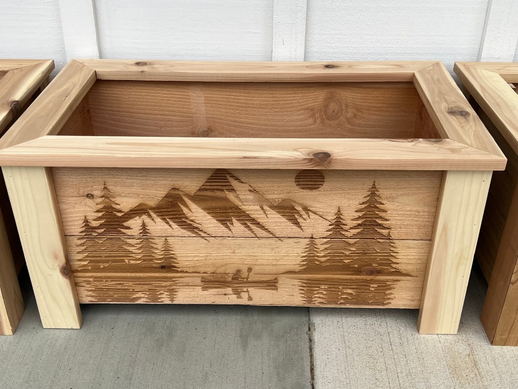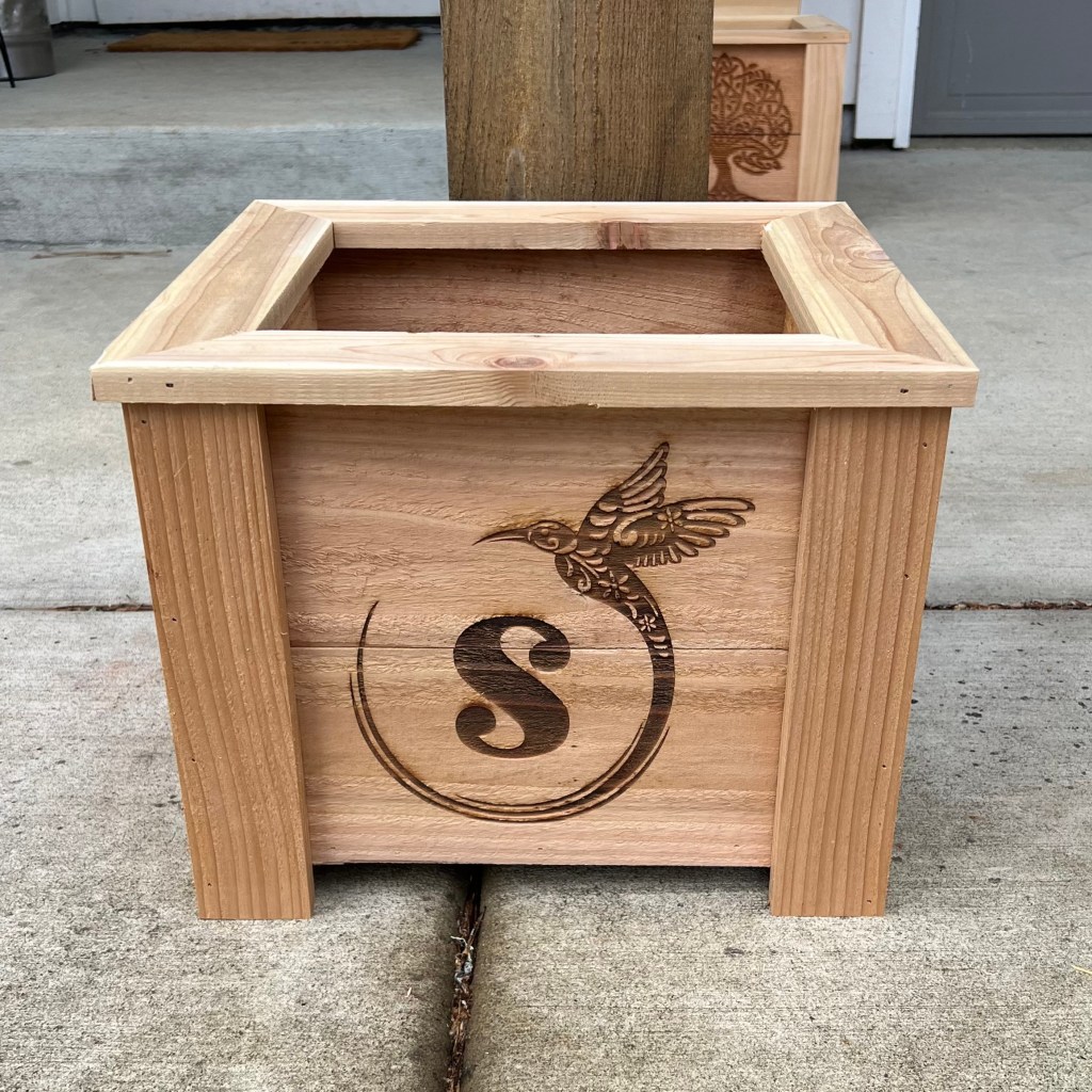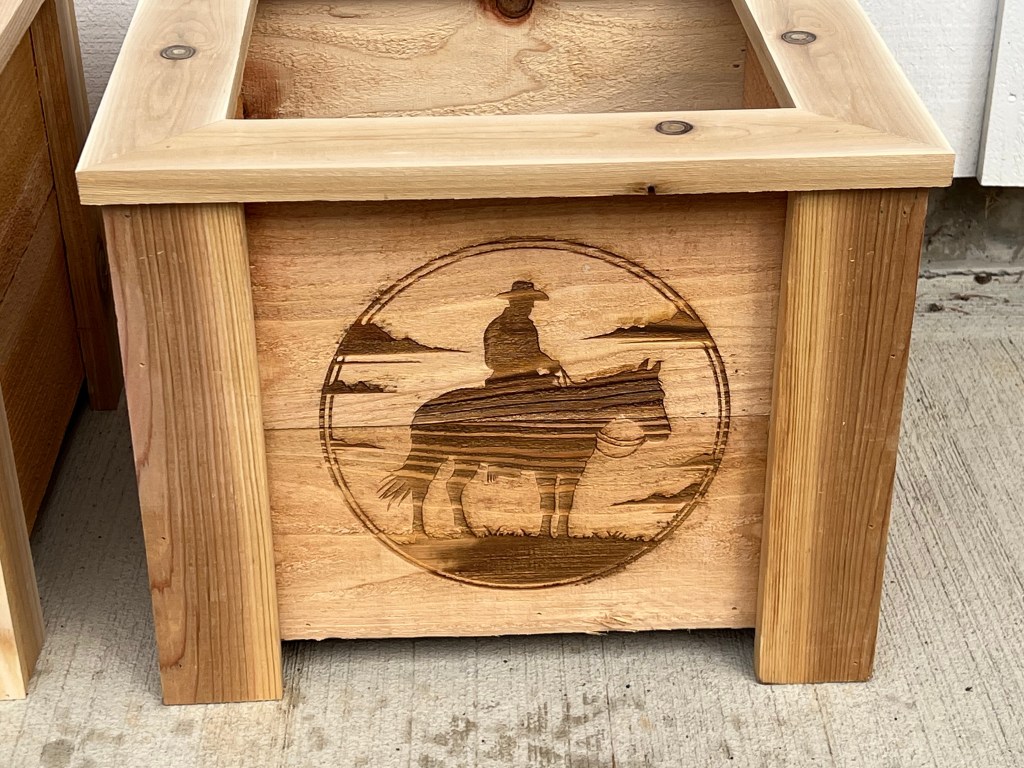 Laser engraved cedar planters are well constructed and developed to resist rot. Cedar is unfinished.