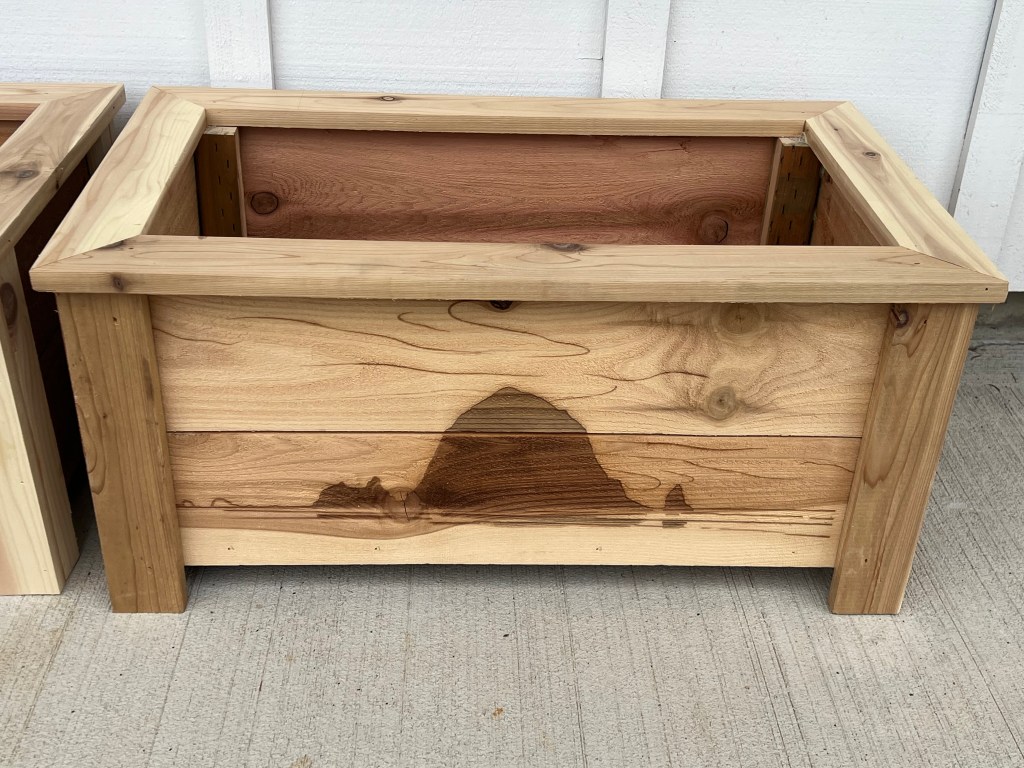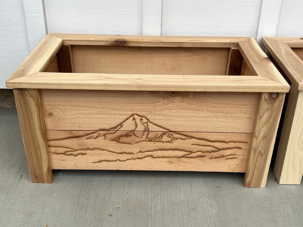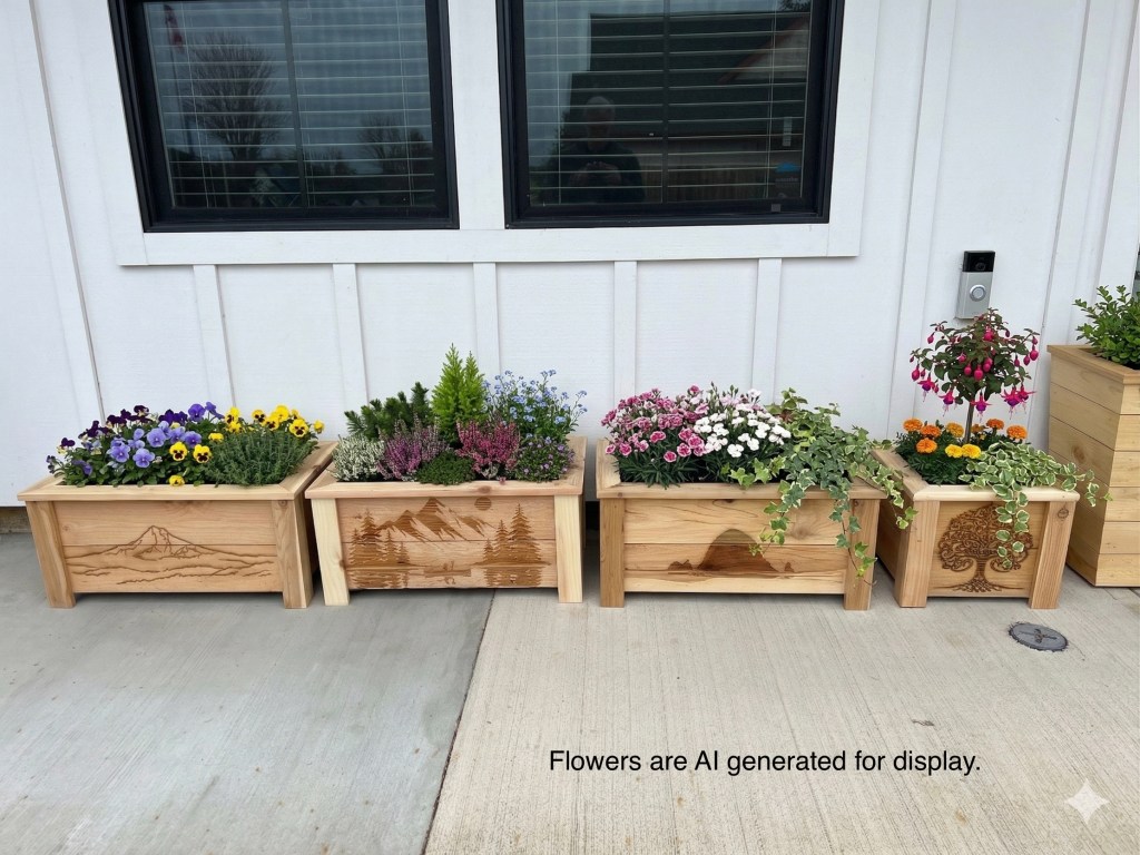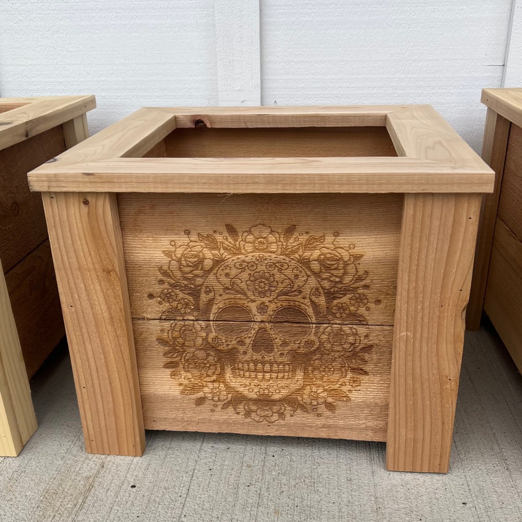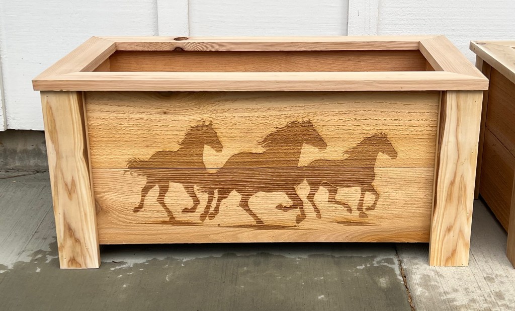 Laser engraved cedar planters are well constructed and developed to resist rot. Cedar is unfinished.